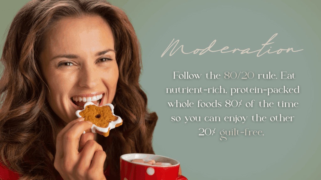 Follow the 80/20 rule. Eat nutrient-rich, protein-packed whole foods 80% of the time so you can enjoy the other 20% guilt-free. And when you do indulge, hydrate! Matching each drink with a glass of water helps prevent dehydration, fatigue, and that dull “post-party” complexion no one wants in holiday photos.