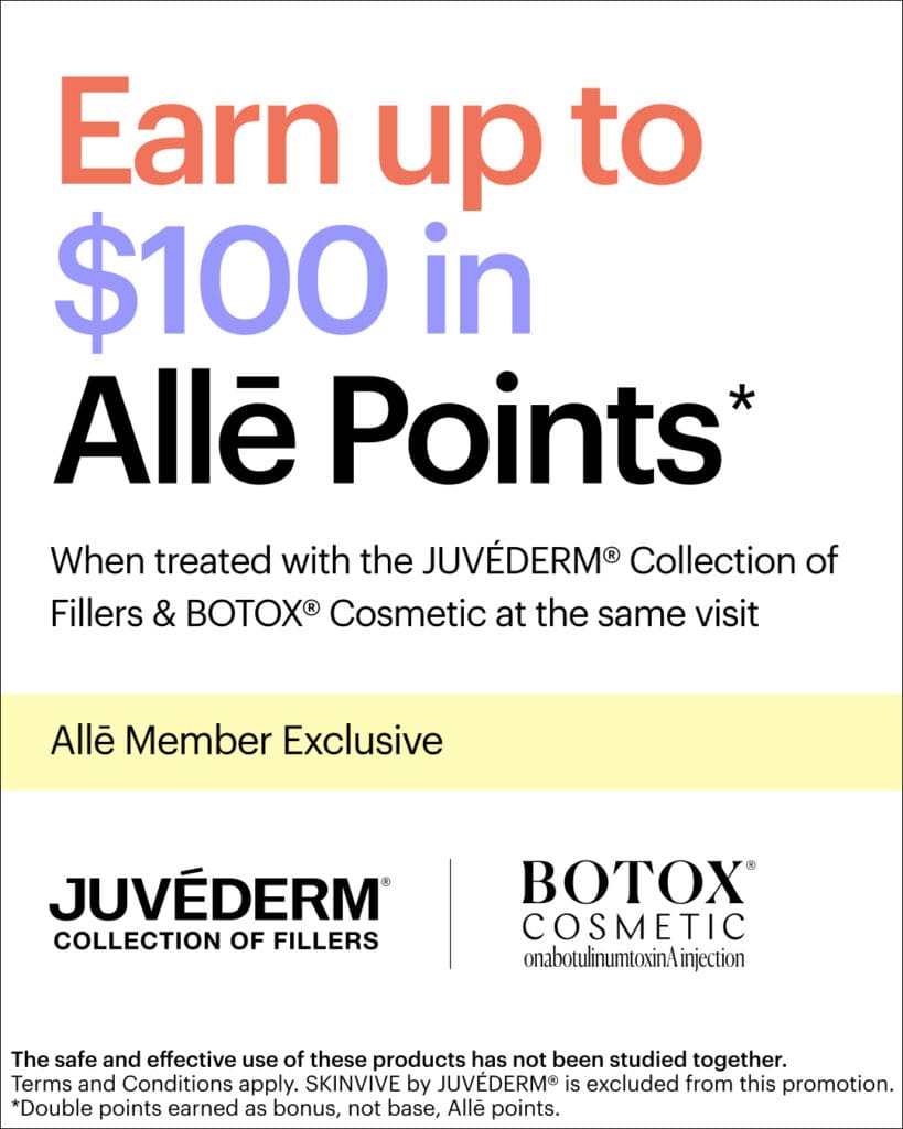 Earn points on Allē brands and other in-office favorites like microdermabrasion and laser hair removal. Exchange your points for offers on Allē products including BOTOX® Cosmetic (onabotulinumtoxinA), JUVÉDERM® Collection of Fillers, SKINVIVE by JUVÉDERM®, and SkinMedica®.